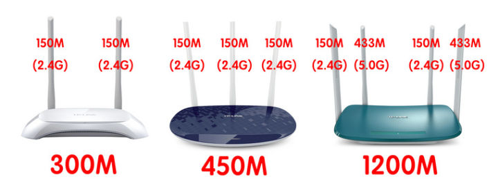 因此大多數(shù)300M的無線路由器都是2根2.4G的天線,而450M的就是3根2.4G的天線。而1200M的雙頻路由器,是兩根2.4G的天線(300Mps)+2根5.0G的天線(867Mbps)≈1200M。