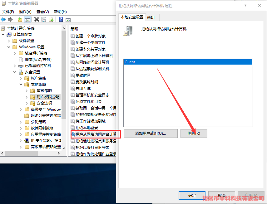 (1)、計算機配置->Windows設置->安全設置->本地策略->用戶權限分配->拒絕從網(wǎng)絡訪問這臺計算機->刪除Guest
