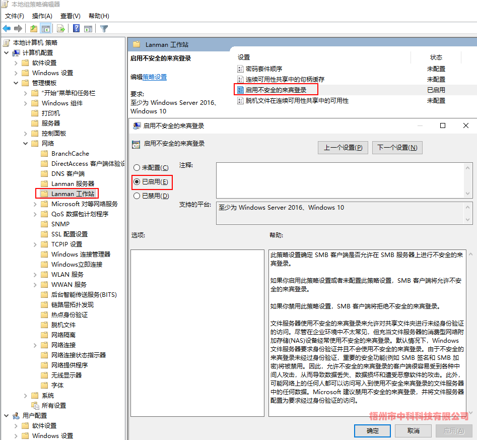 (3)計算機配置->管理模板->網(wǎng)絡->Lanman工作站->啟用不安全的來賓登陸->已啟用