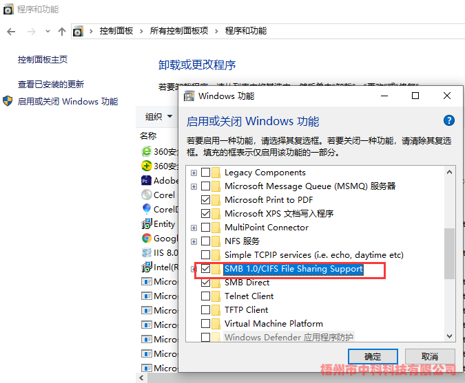 在控制面板中,打開“程序和功能”->啟用或關閉Windows功能->將“SMB 1.0/CIFS File Sharing Support”勾選->確定